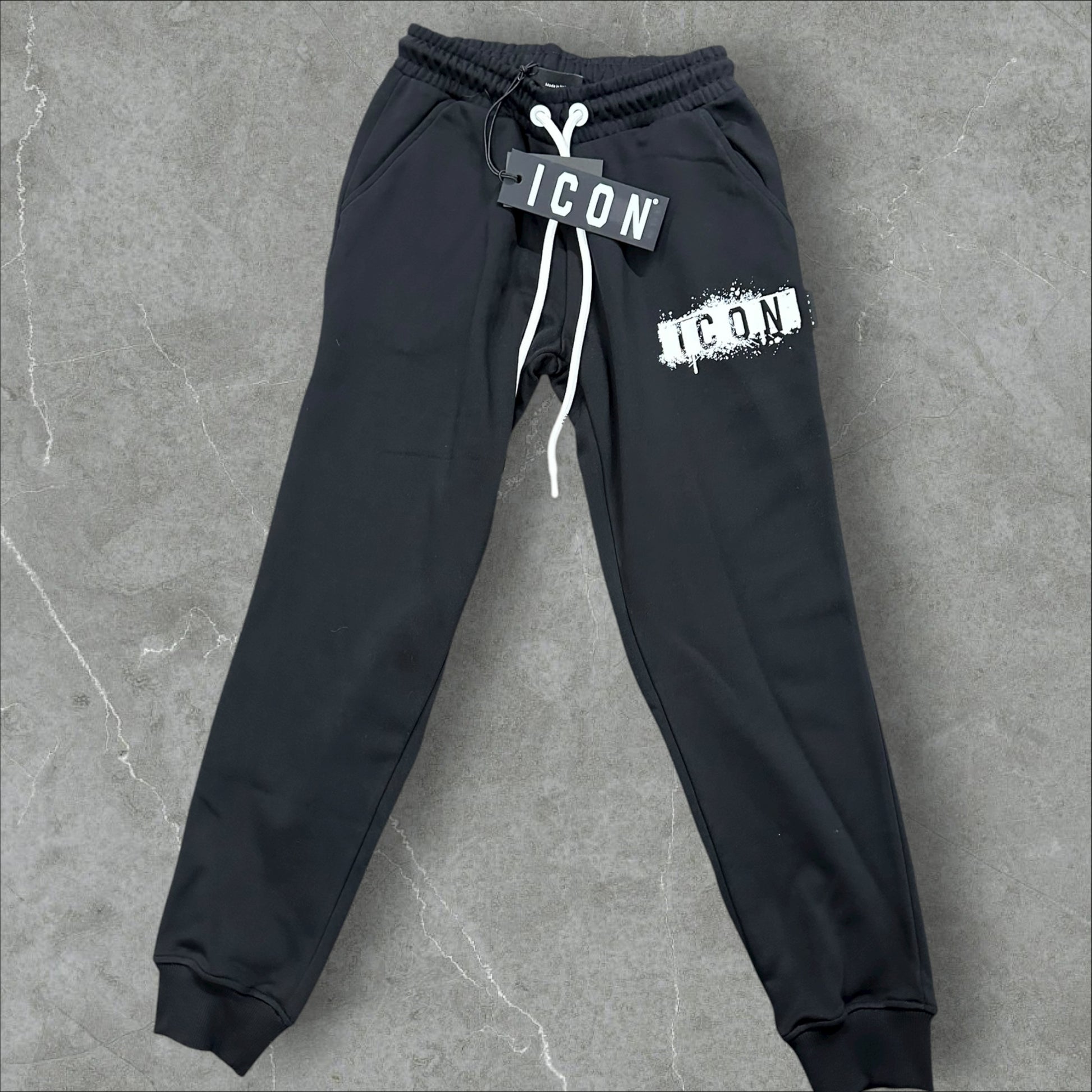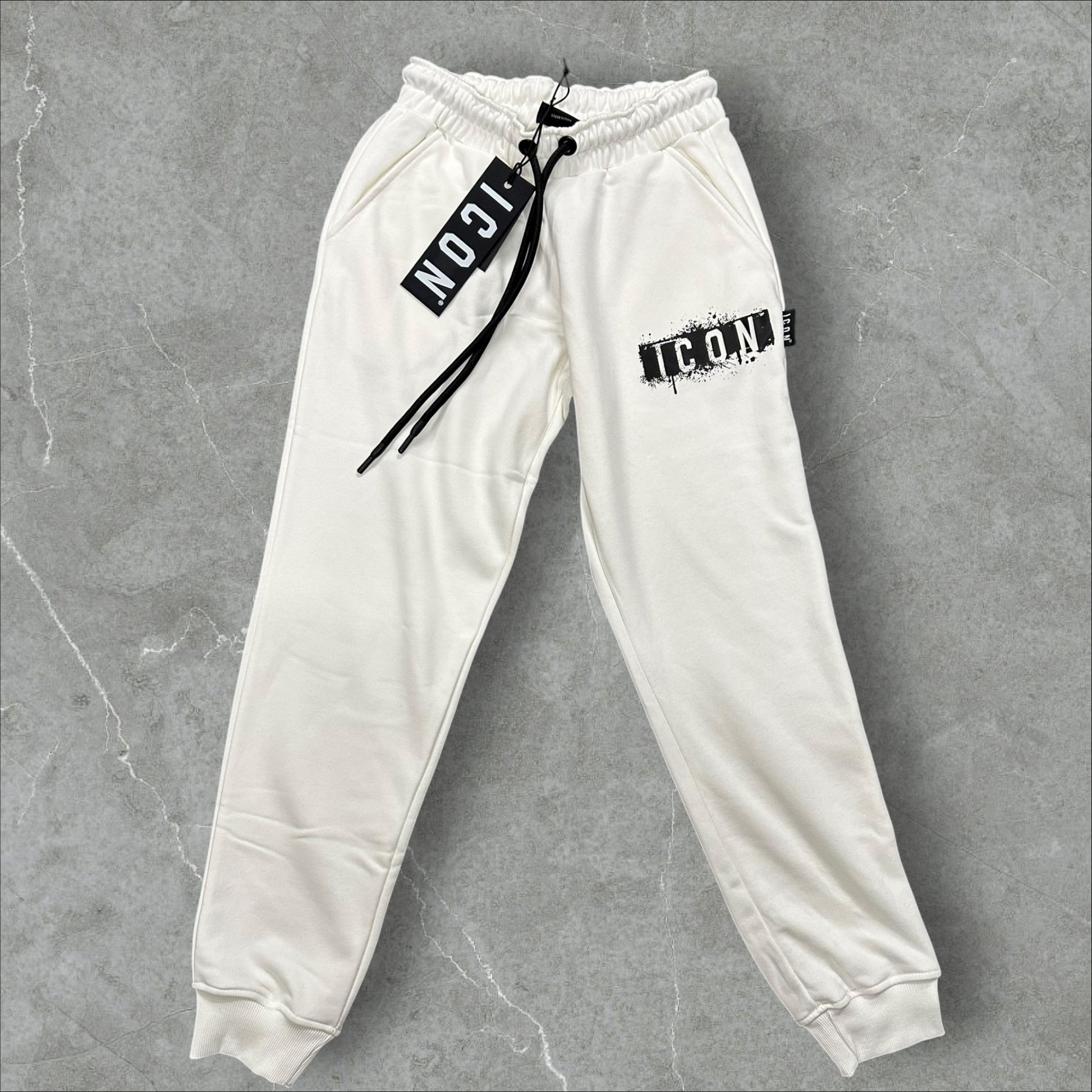 Pantaloni della tuta, marchio icon con spruzzi, vestibilità aderente il prezzo indicato è scontato del 20% dal cartellino